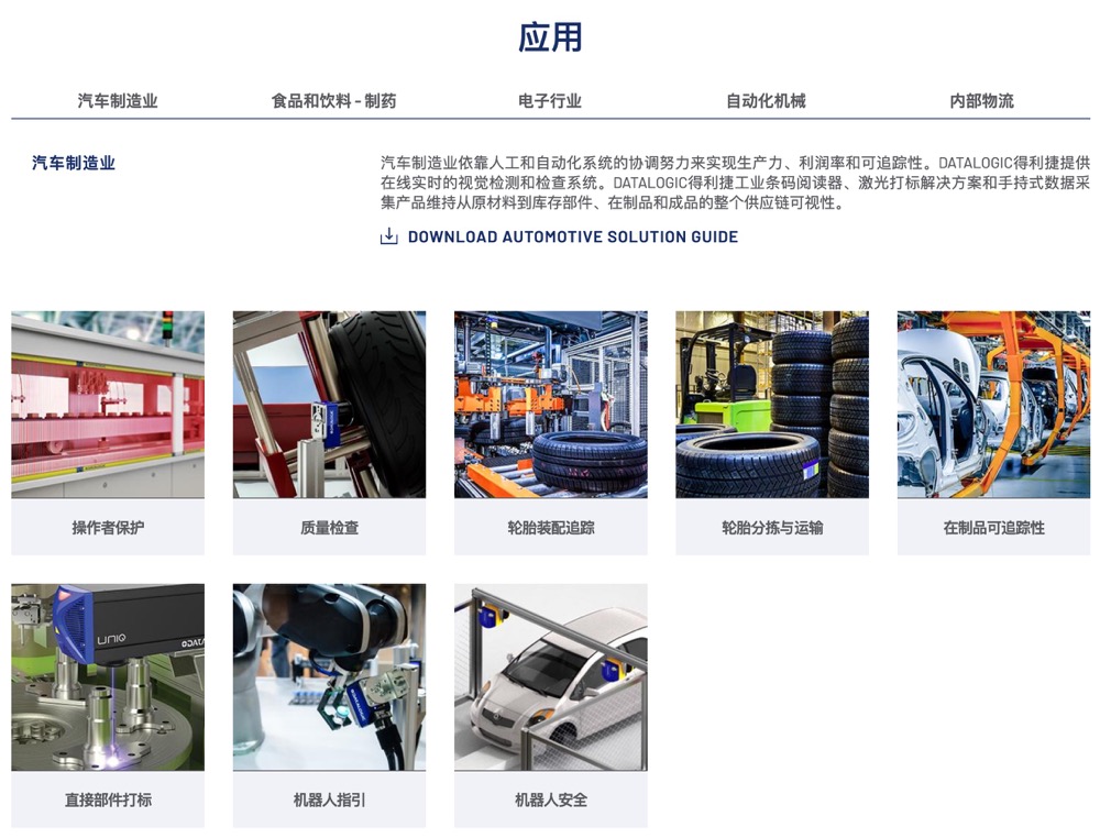 通过安装DATALOGIC得利捷自动识别设备、视觉系统和传感器, 制造业变得更容易,更可靠。 Datalogic得利捷技术可以检测物体存在,安全光幕保护操作人员安全,视觉传感器用于确保产品质量,激光打标用于标识物品,通过固定的工业和手持式条码扫描器确保过程和产品的可追踪性,而移动数据终端可以在制造过程和零售全程追踪物品。